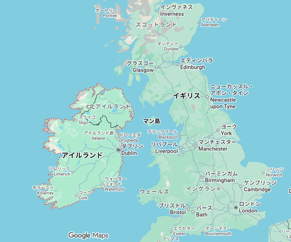アイルランドは北西ヨーロッパに位置し、首都はダブリン。人口490万人のうち約4割がダブリン近郊に住んでいます。北アイルランド(イギリス領)とのみ陸上で国境を接しています。